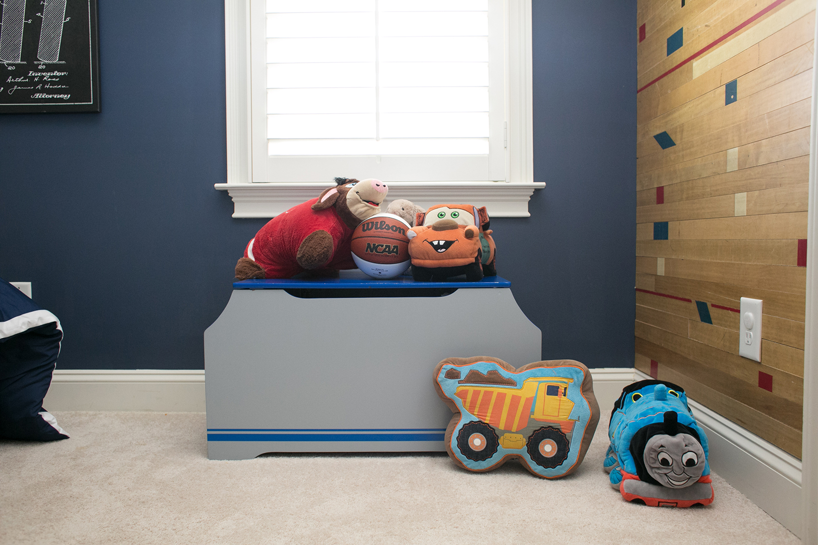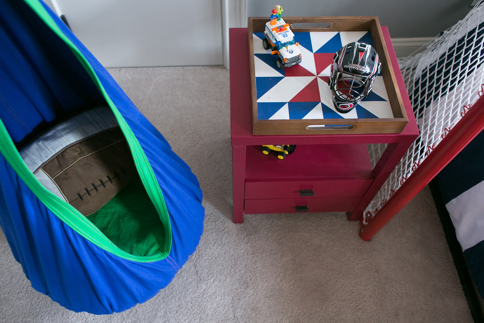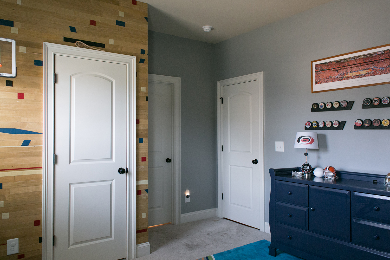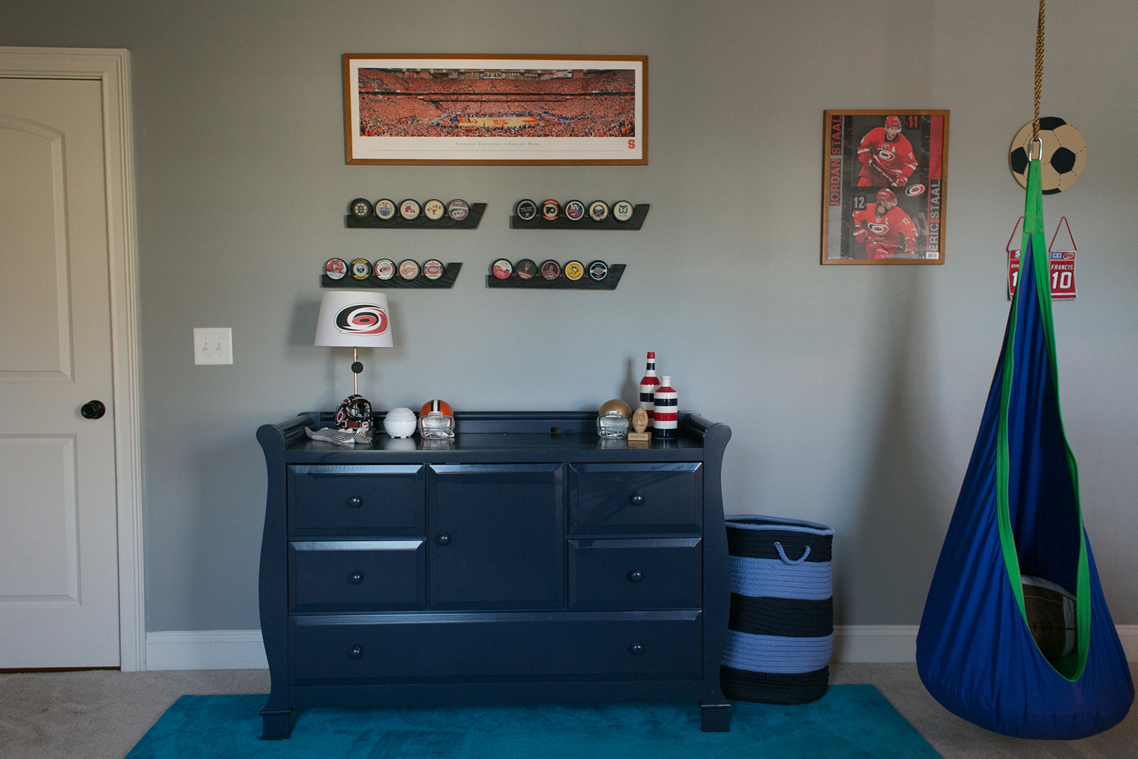 In the sports-themed boy’s bedroom, we conveyed this five year-old’s love of hockey and sports into great design with fun elements.