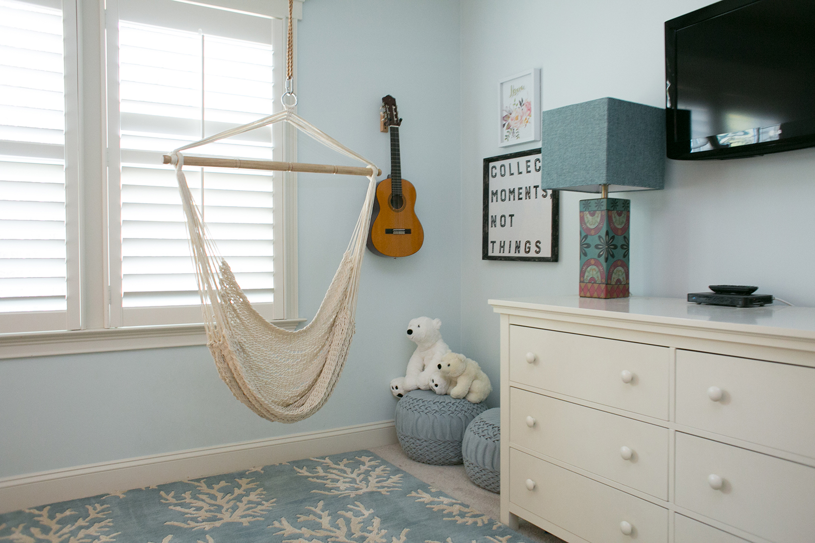 Our designs are featured in four spaces in this home, transforming each to function better and represent our clients’ style and sensibilities. The beach-inspired girl’s bedroom is a great space to relax and has the style and functionality to grow into. Designs for this home office are stylish yet practical for its everyday use.