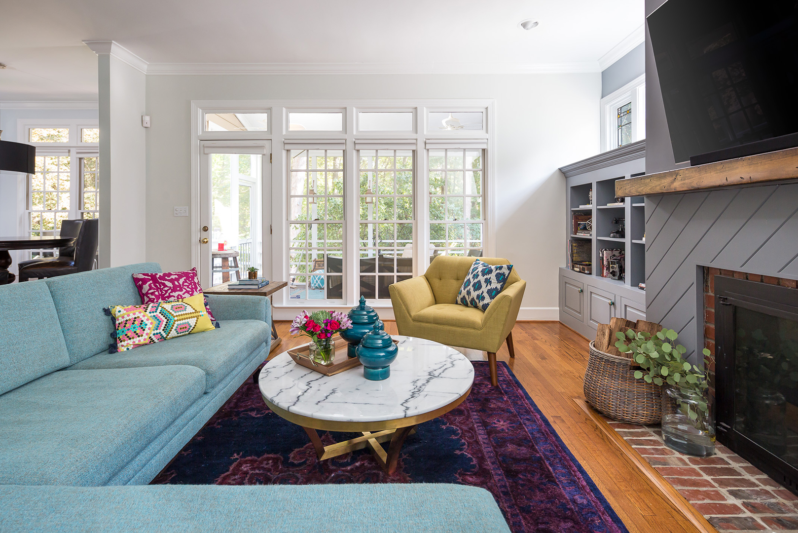 In this project, we transformed a traditional-style home into a modern, funky, and colorful residence. By using different colors and patterns, mixing textures, and using unique design elements, these spaces portray a fun family lifestyle. The result is a unique space that has been recognized nationally with a 2018 Master Design Award. You can also read more about the intricacies of our interior design process on this project.>>