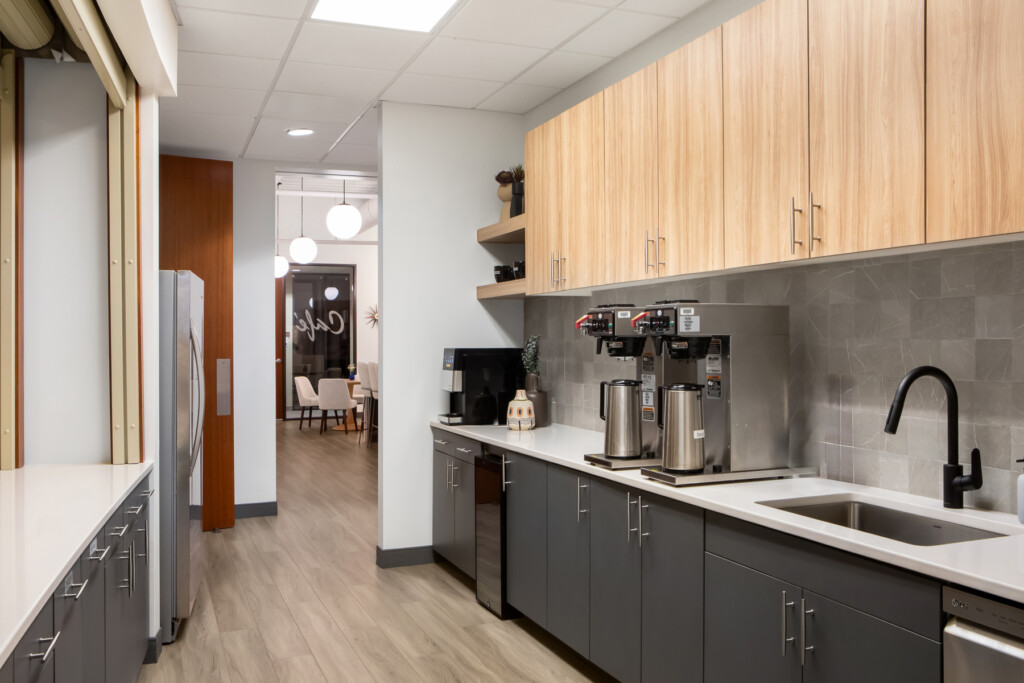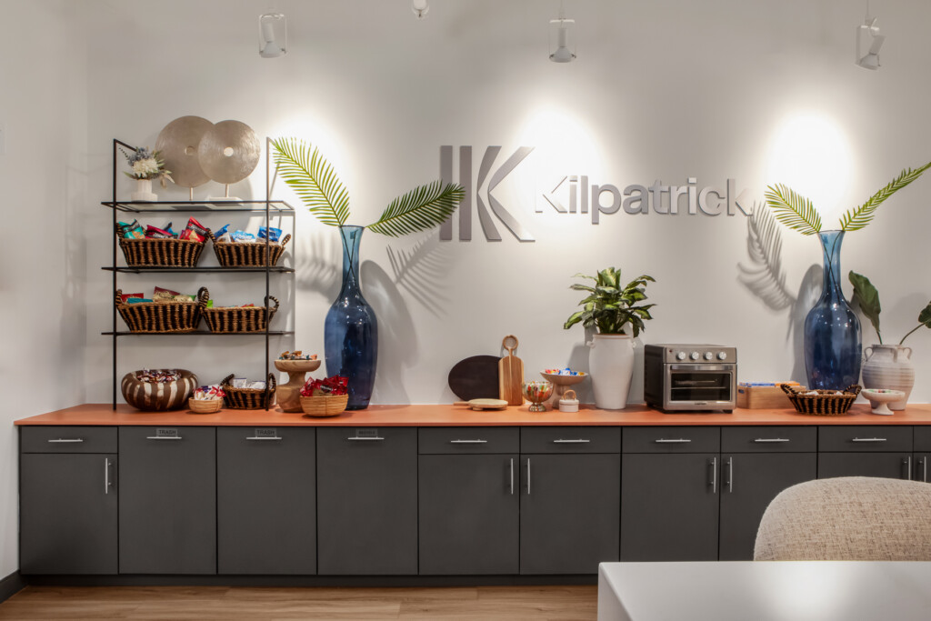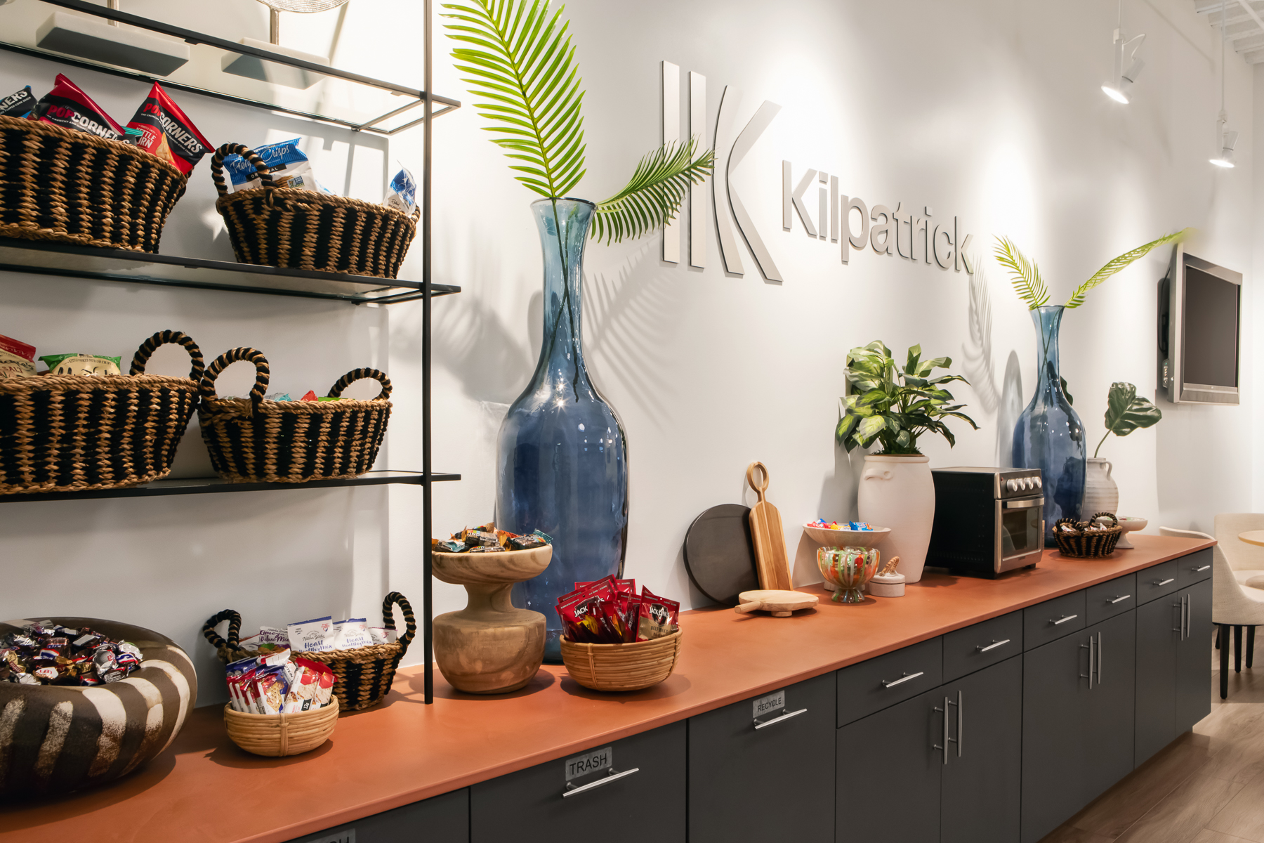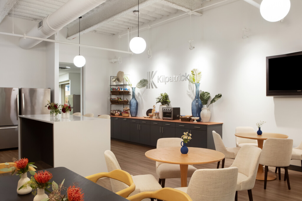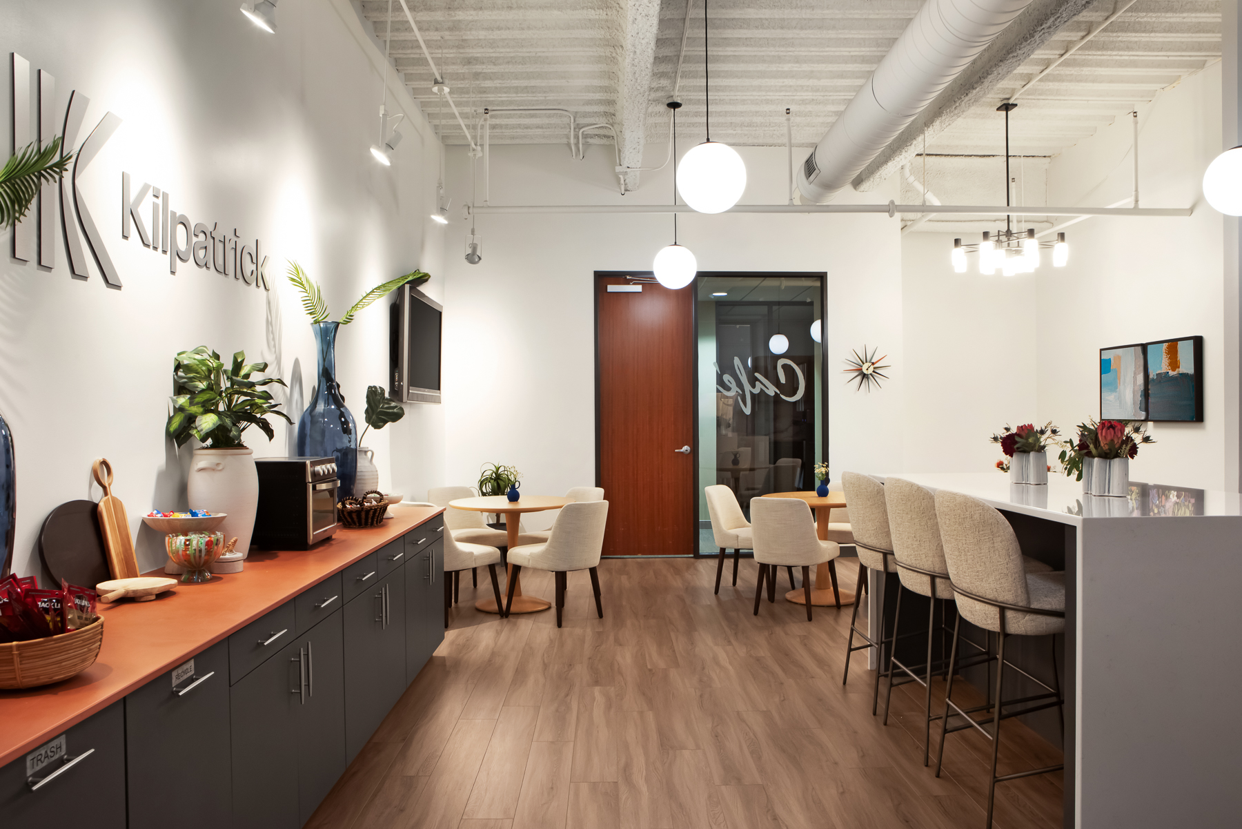 TEW Design Studio partnered with Raleigh law office, Kilpatrick Townsend & Stockton (KTS), to reimagine their communal breakroom and servery as part of a larger effort to align the firm’s environment with its refreshed brand identity. The goal was to move away from a dated, utilitarian space toward one that feels bright, balanced, and reflective of the firm’s collaborative culture.