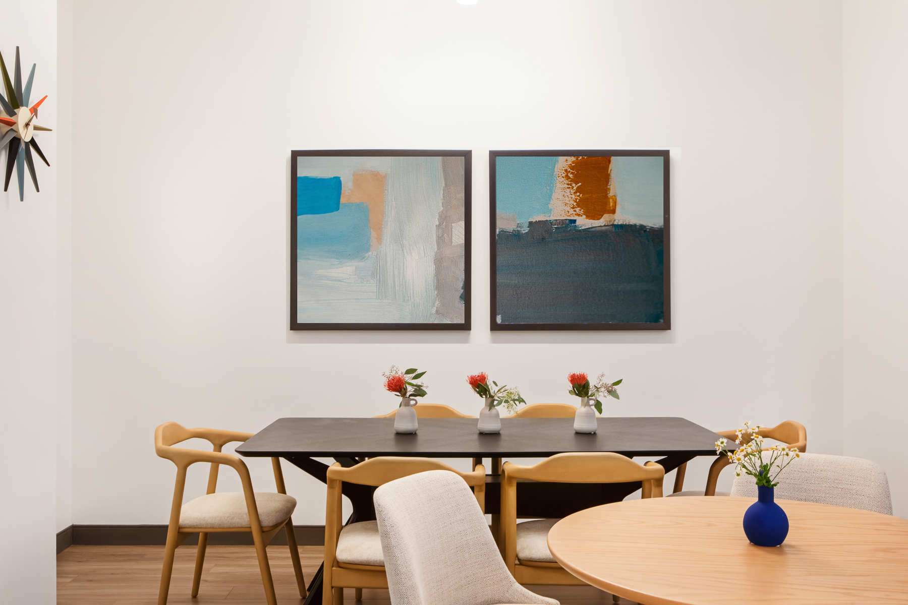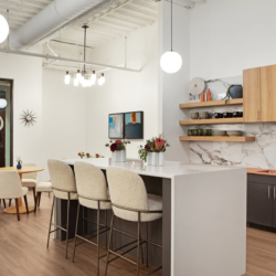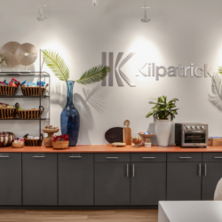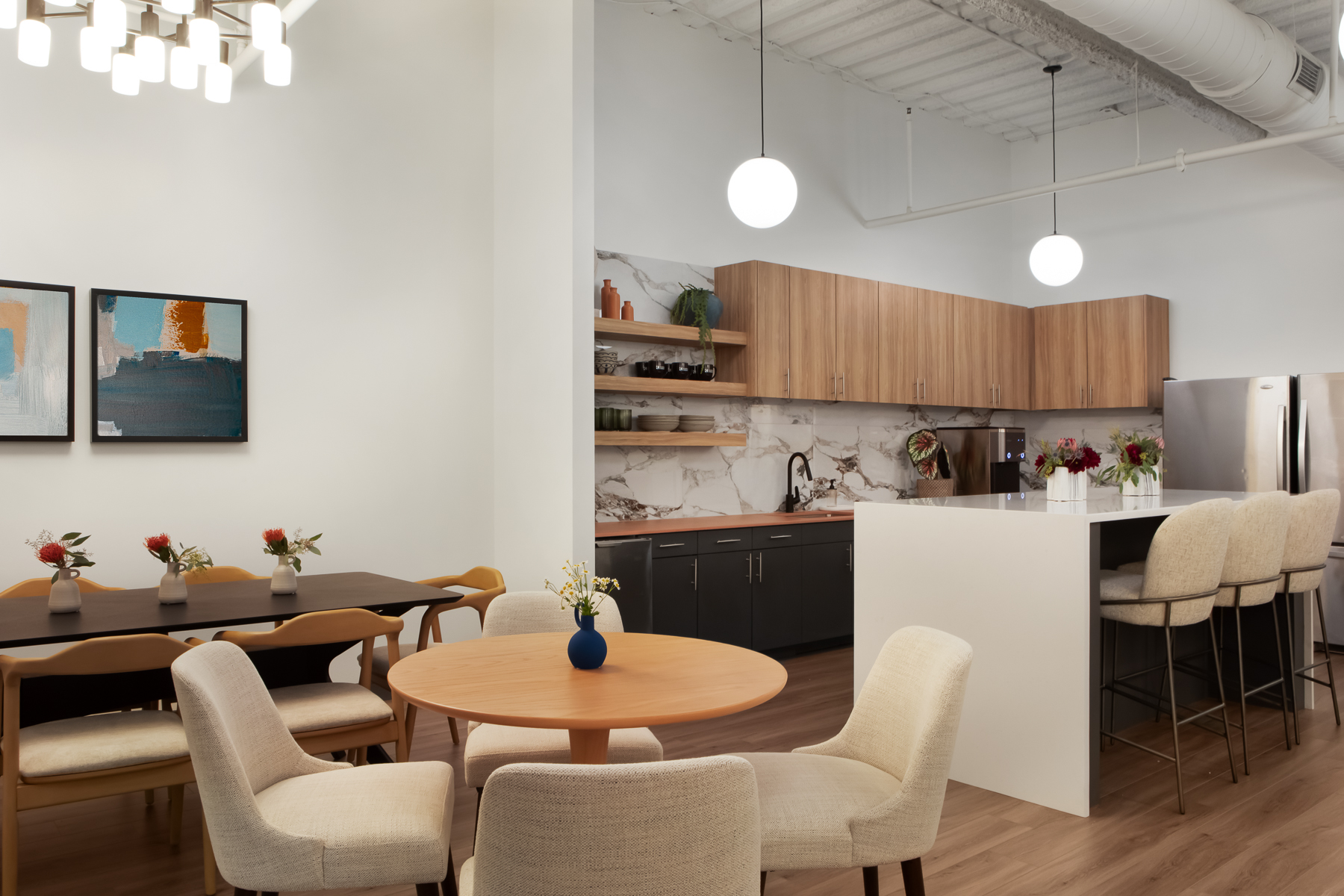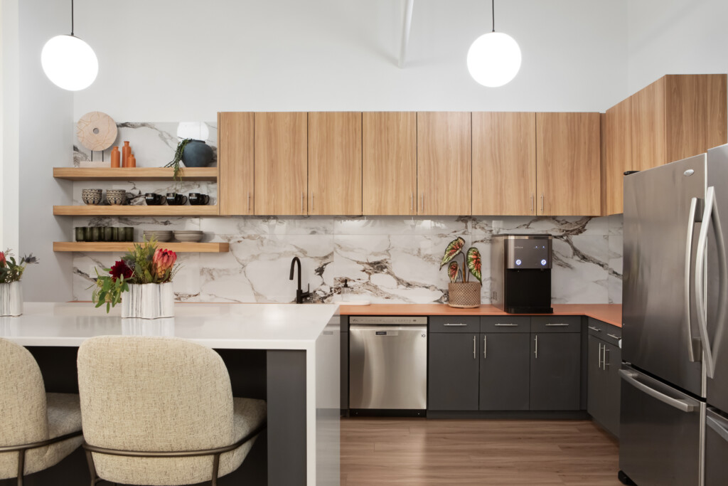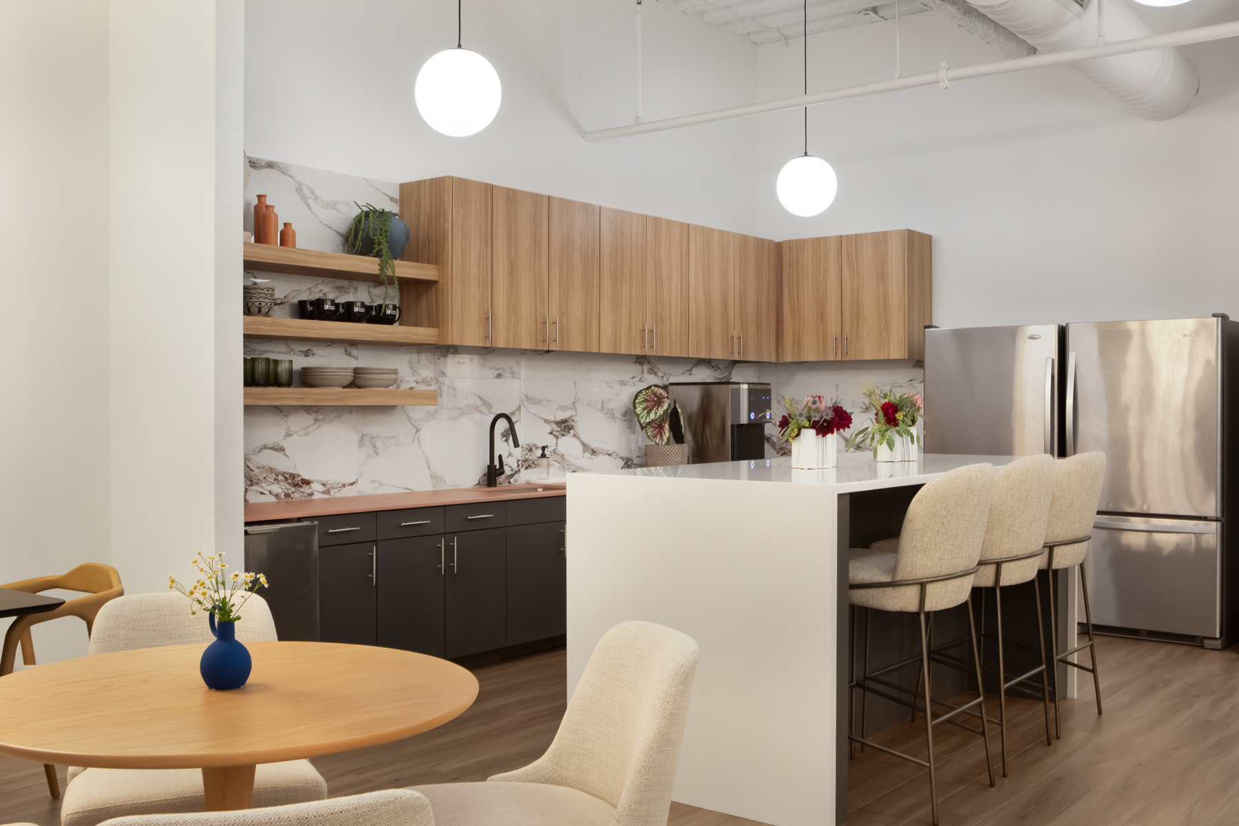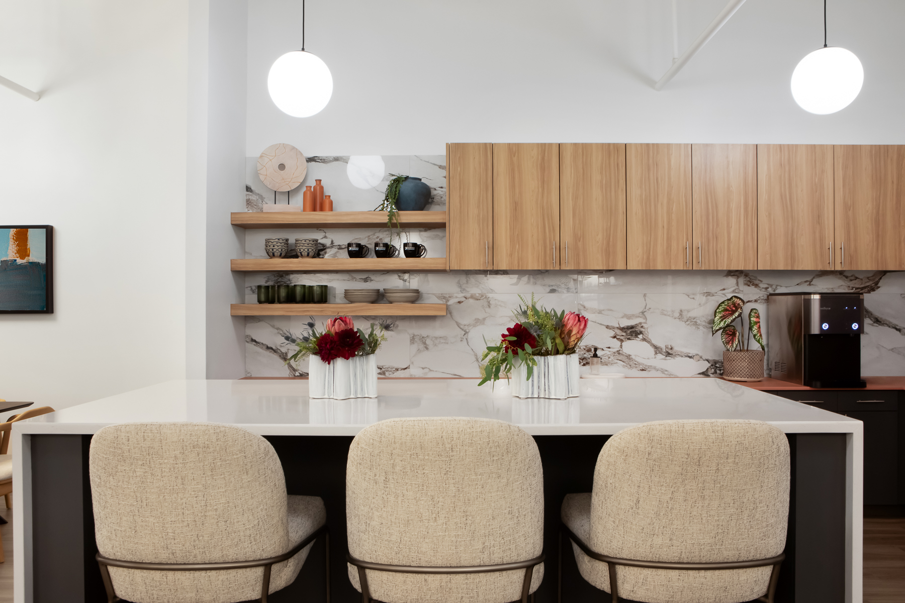 TEW Design Studio partnered with Raleigh law office, Kilpatrick Townsend & Stockton (KTS), to reimagine their communal breakroom and servery as part of a larger effort to align the firm’s environment with its refreshed brand identity. The goal was to move away from a dated, utilitarian space toward one that feels bright, balanced, and reflective of the firm’s collaborative culture.