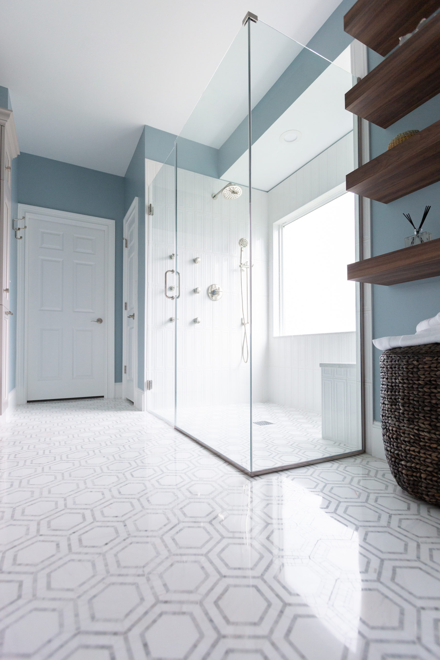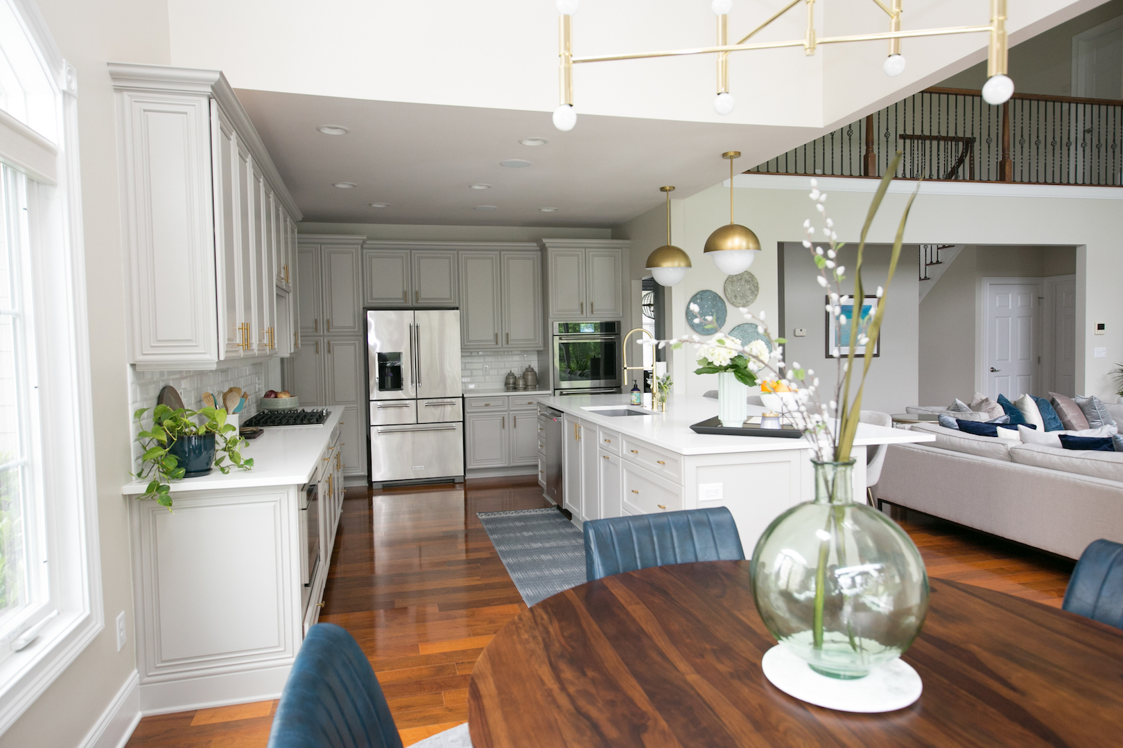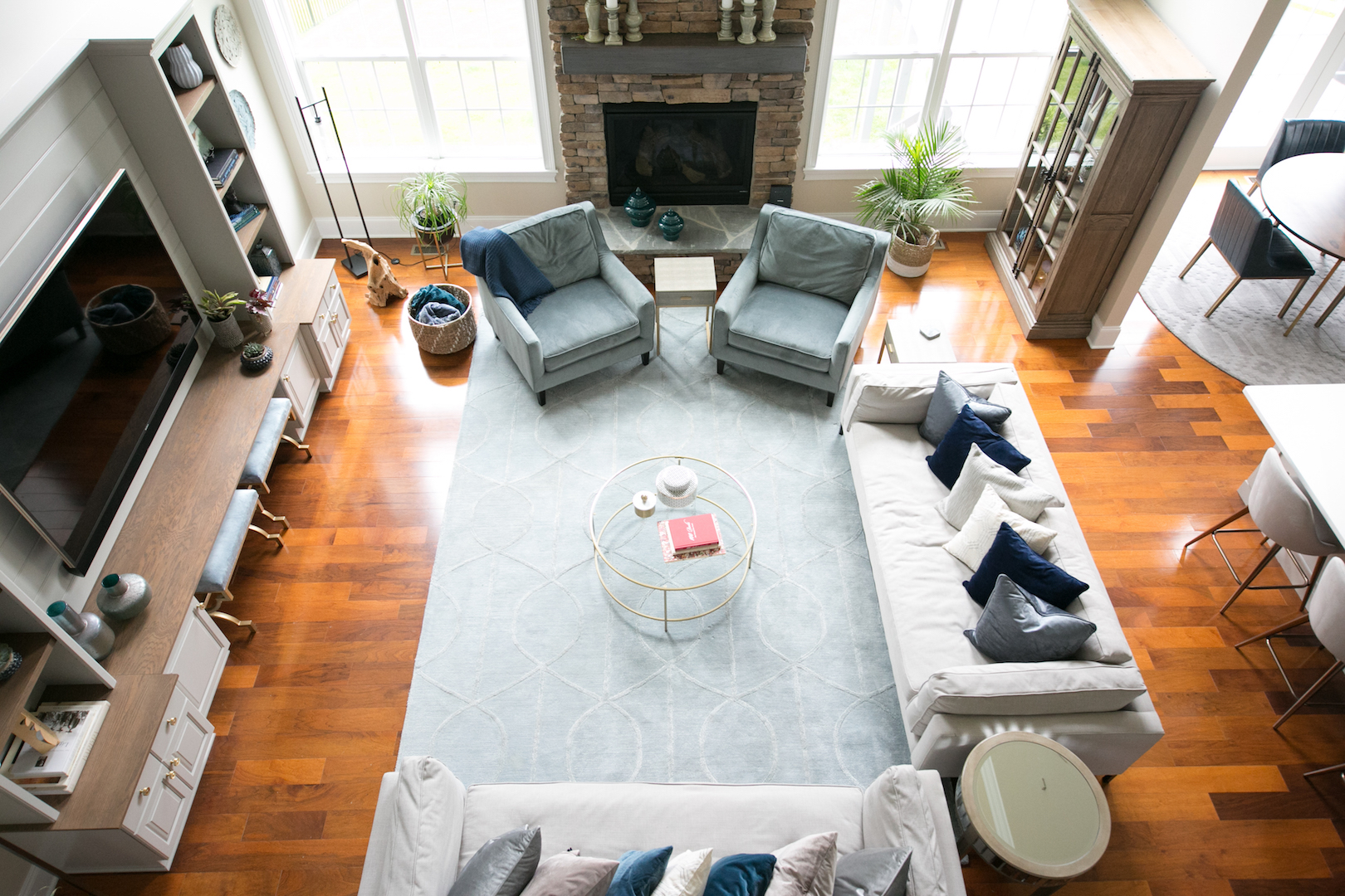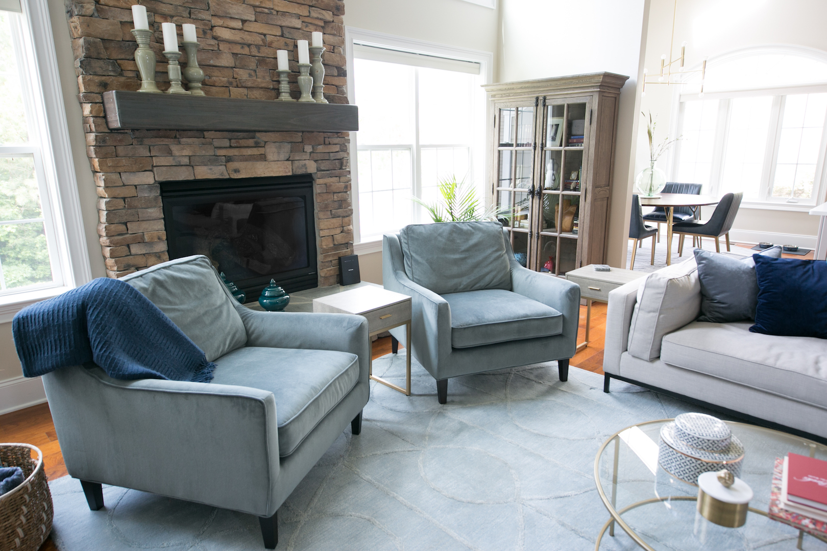 This interior design project in Durham, N.C., is an example of a comprehensive redesign carried out in phases. We enjoyed working with this lovely family in stages over a few years to transform the kitchen, family room, master bedroom and bath, home office as well as other spaces. The changes helped to illuminate their home in so many ways and feature more natural colors, graphic patterns and textures. See the before/after and read more about the dramatic master bathroom transformation.
