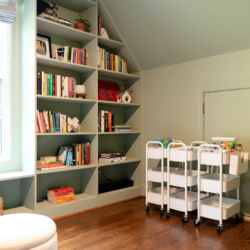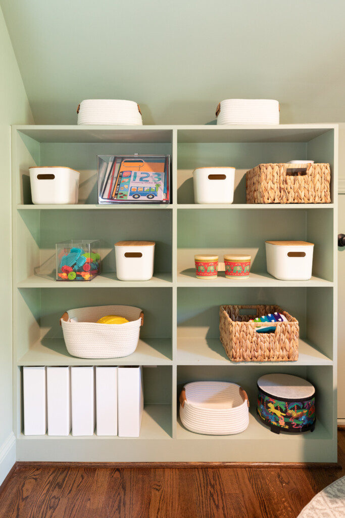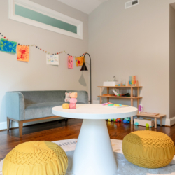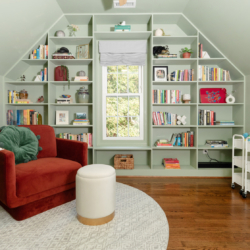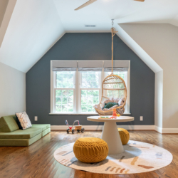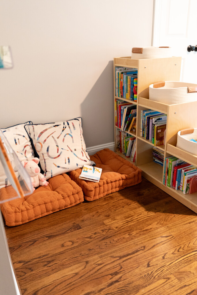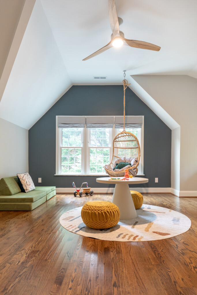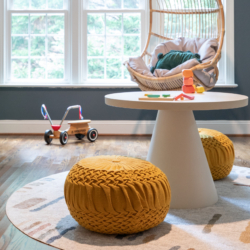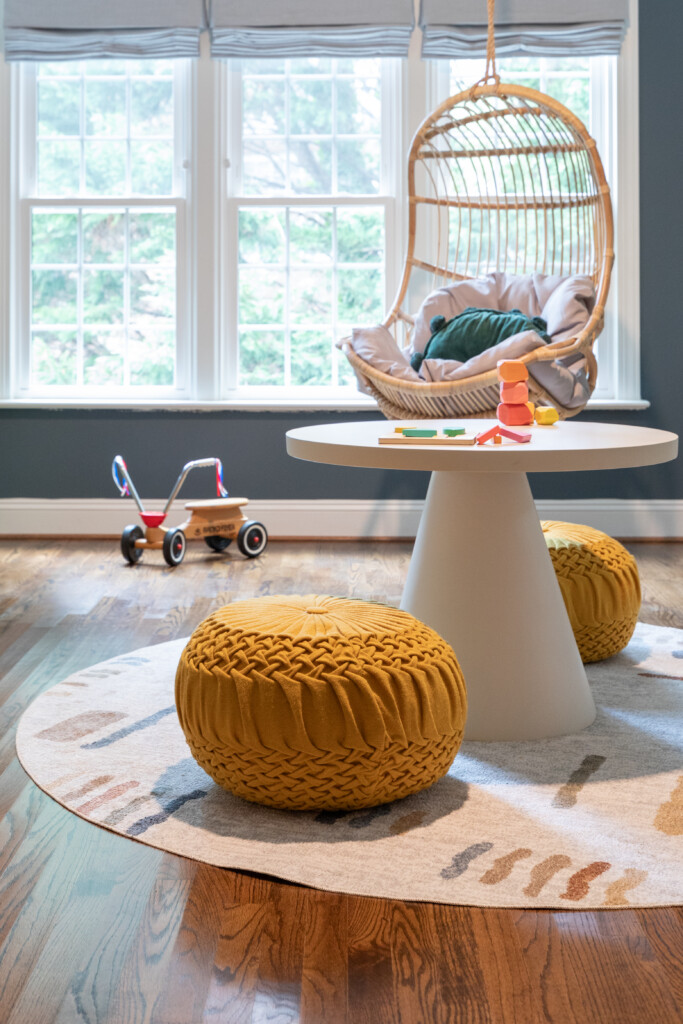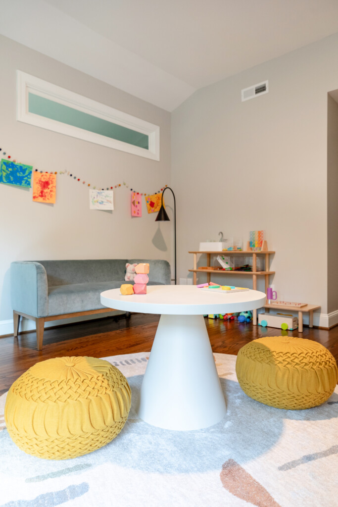 Toddler-Friendly Playroom – This vibrant play space is built for little hands and big imaginations. Floor-level sofas and low bookshelves make everything easily accessible, while a mix of playful poofs adds extra spots to sit, lounge, or build forts.